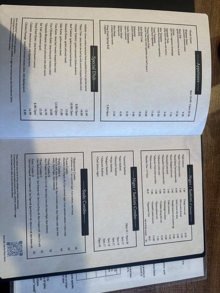Rainbow roll, dragon roll, 8 pieces assorted nigiri and 8 pieces assorted sashimi. 2 miso soup. Contain raw.
